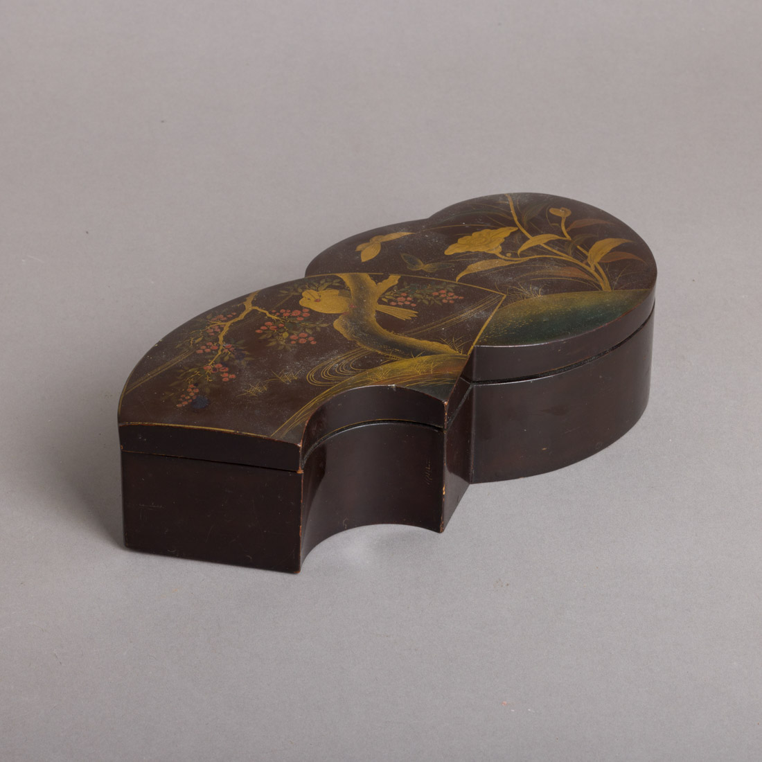 Em papier maché lacado a negro, decoração policromada e doura "flores e pássaro e insectos". Sinais de uso e pequenos defeitos.