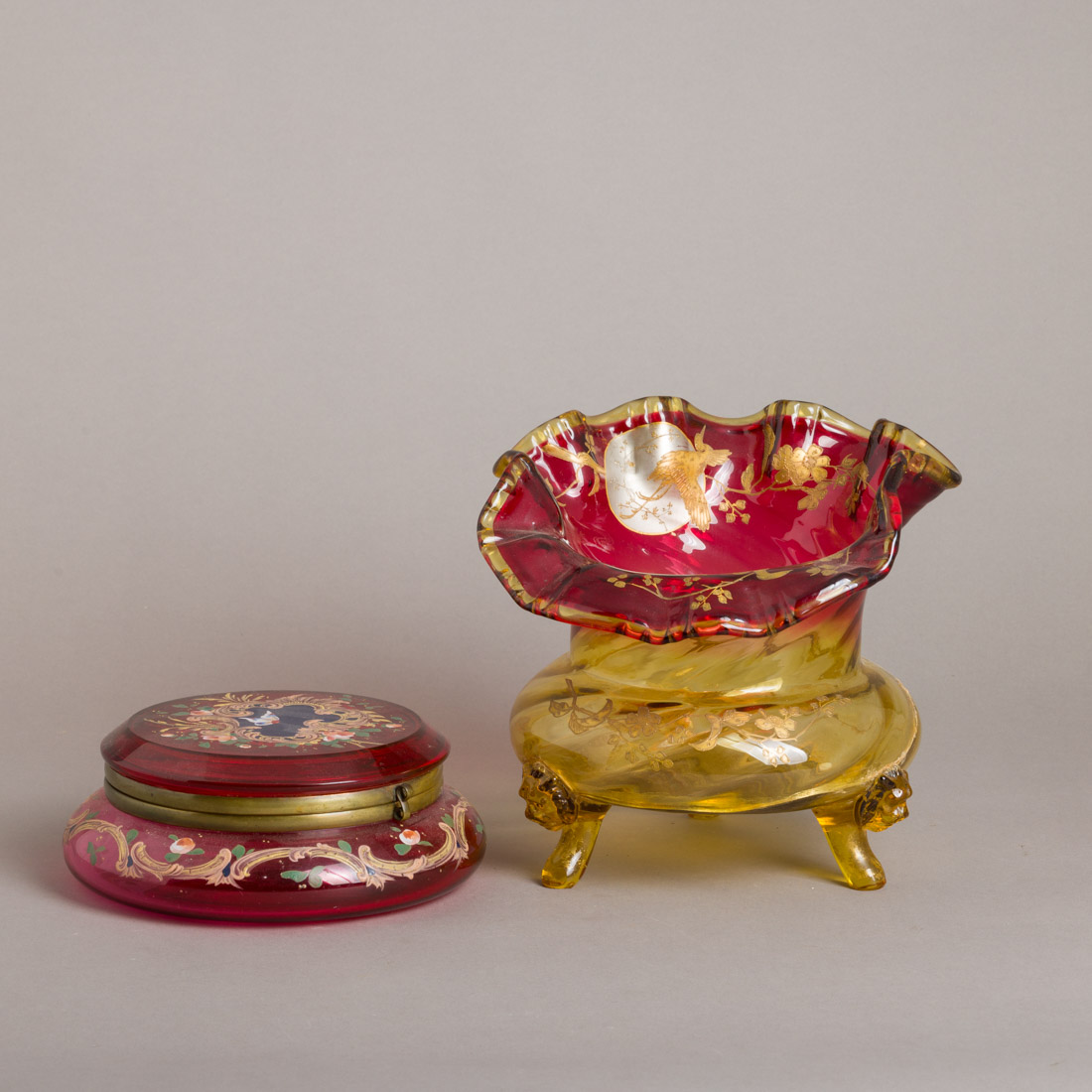 Em vidro colorido pintado, decoração policromada e dourada "flores e pássaros". Sinais de uso e floreira com base colada.