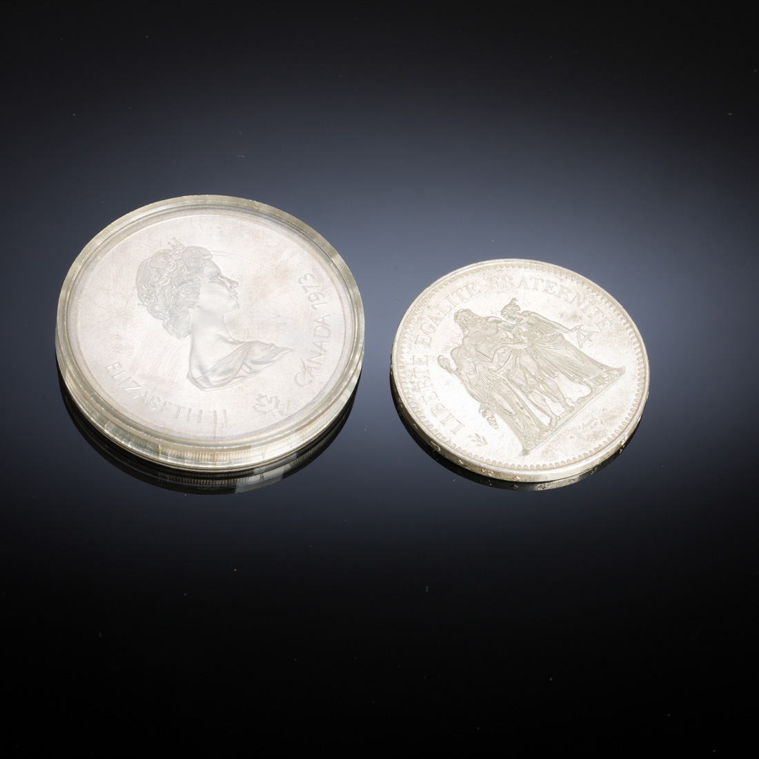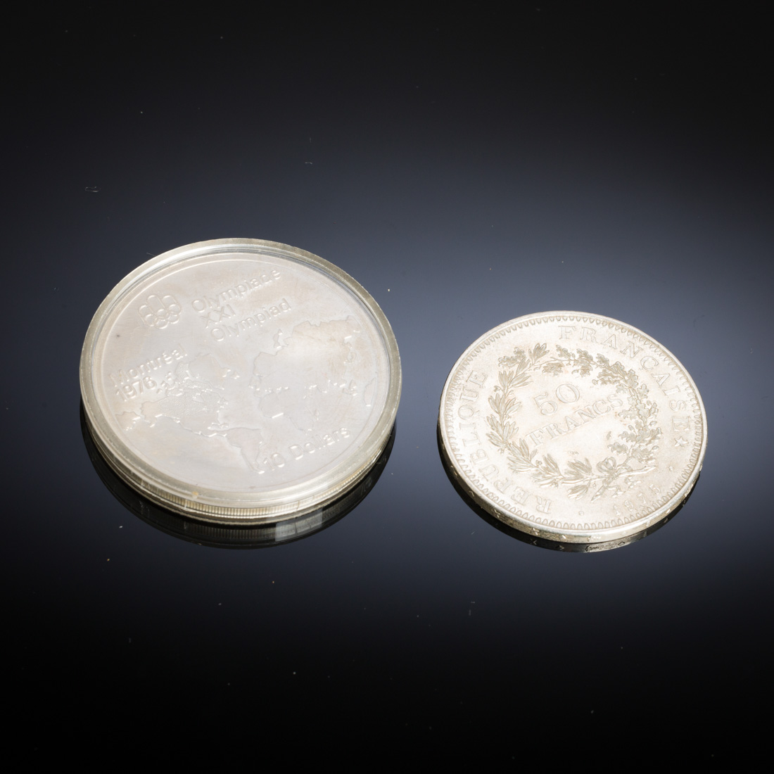 Em prata: 50 Francos de 1975, alegoria com Hércules e inscrição: Liberté, Egalité, Fraternité, França, 5ª República e 10 dólares canadianos, comemoração dos Jogos Olímpicos de Montreal em 1976. Bom estado, ligeira oxidação. Peso aprox.: 78 g. Dim.: 4,1 e4,5 cm.