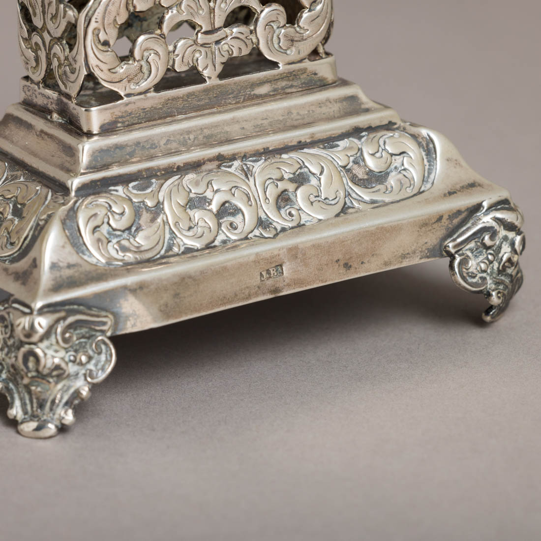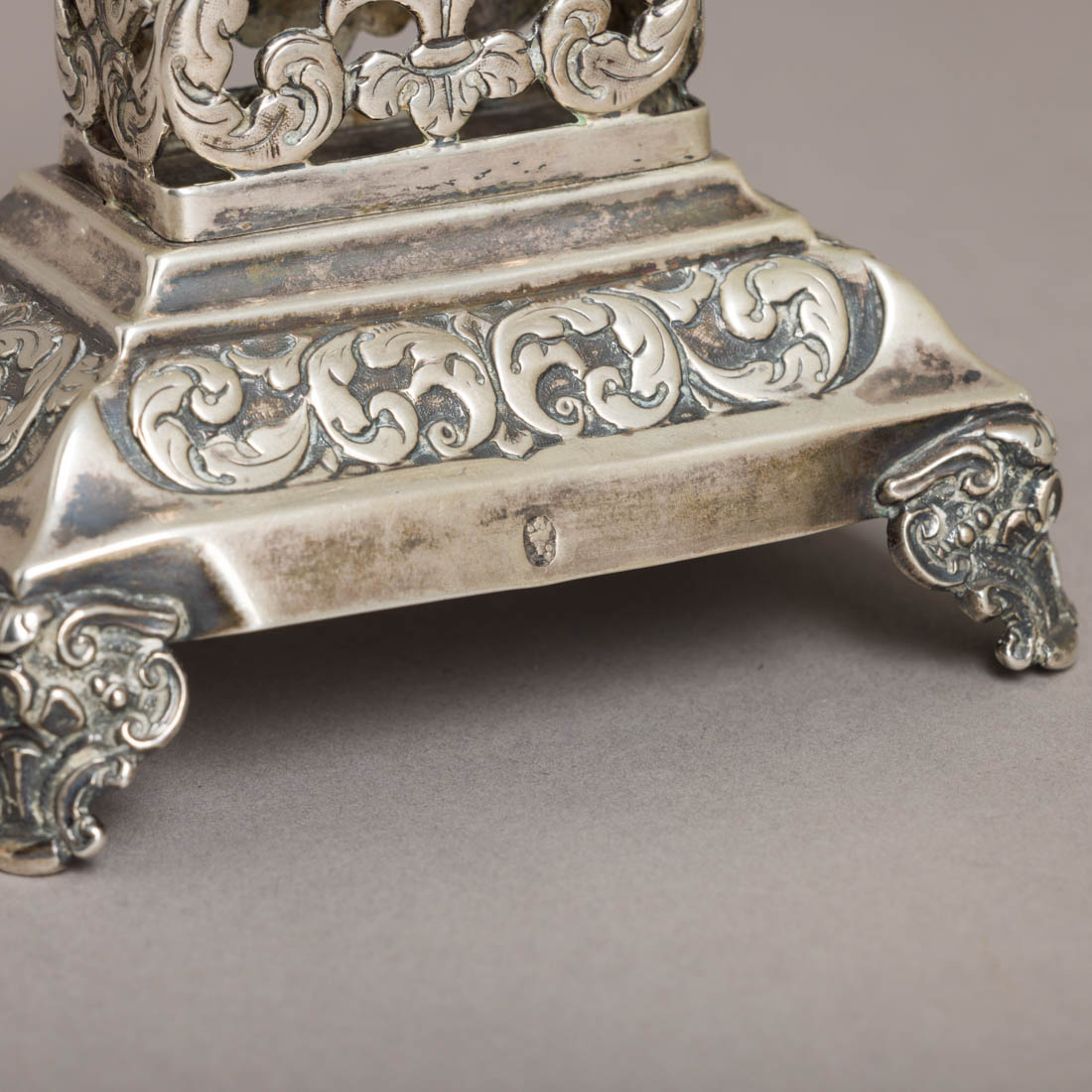 Em prata portuguesa do Séc. XIX, marca de ensaiador de Lisboa (L-41) datável de 1843-1870 e de ourives (L-377) datável de 1810-1881, decoração relevada e vazada "elementos vegetalistas". Sinais de uso e amolgadelas.