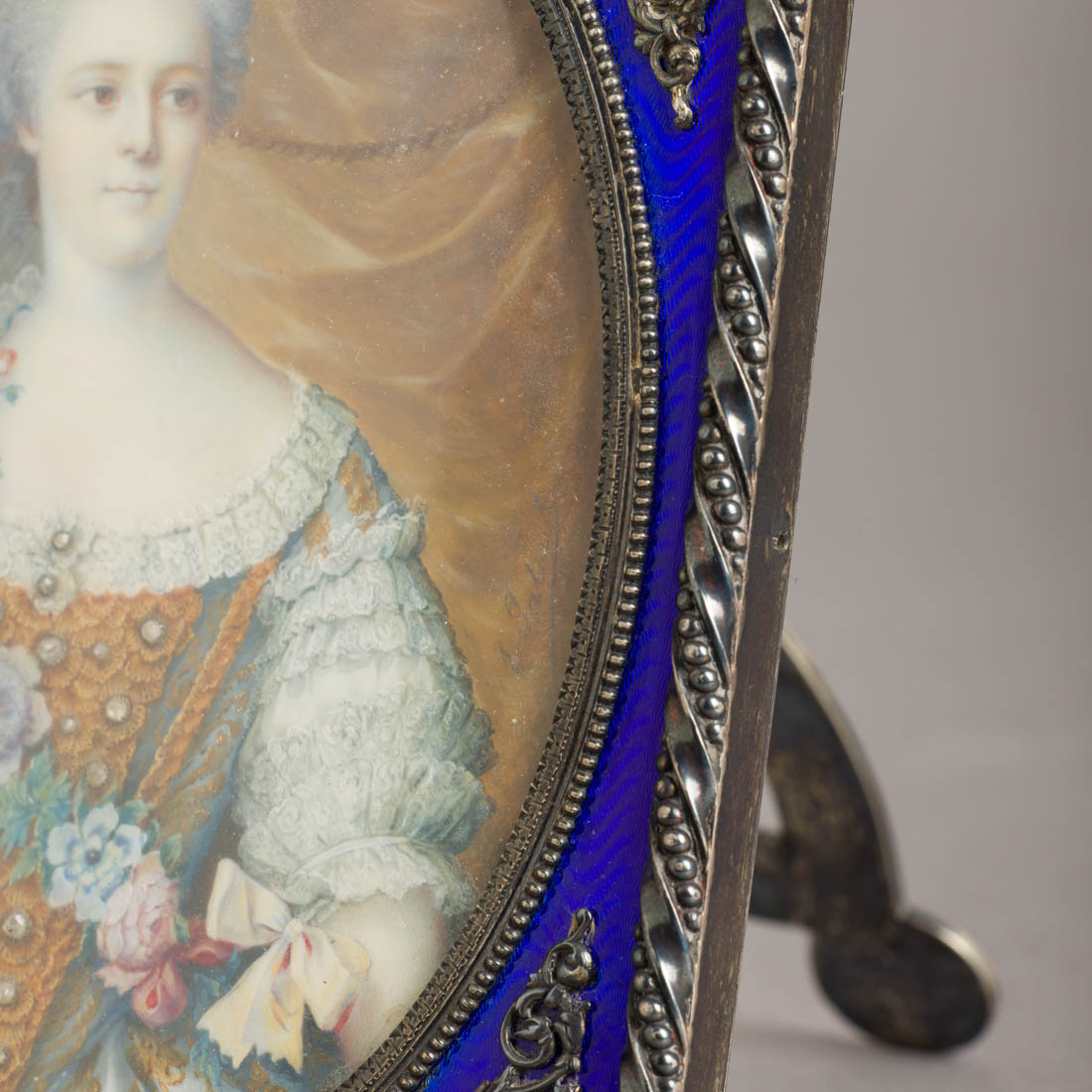 Miniatura sobre marfim com pedras incrustadas, assinada, moldura em prata francesa de 950, marcas de garantia de teor (1838), decoração relevada com esmaltes a azul. Com suporte para mesa e argola de suspensão. Sinais de uso.