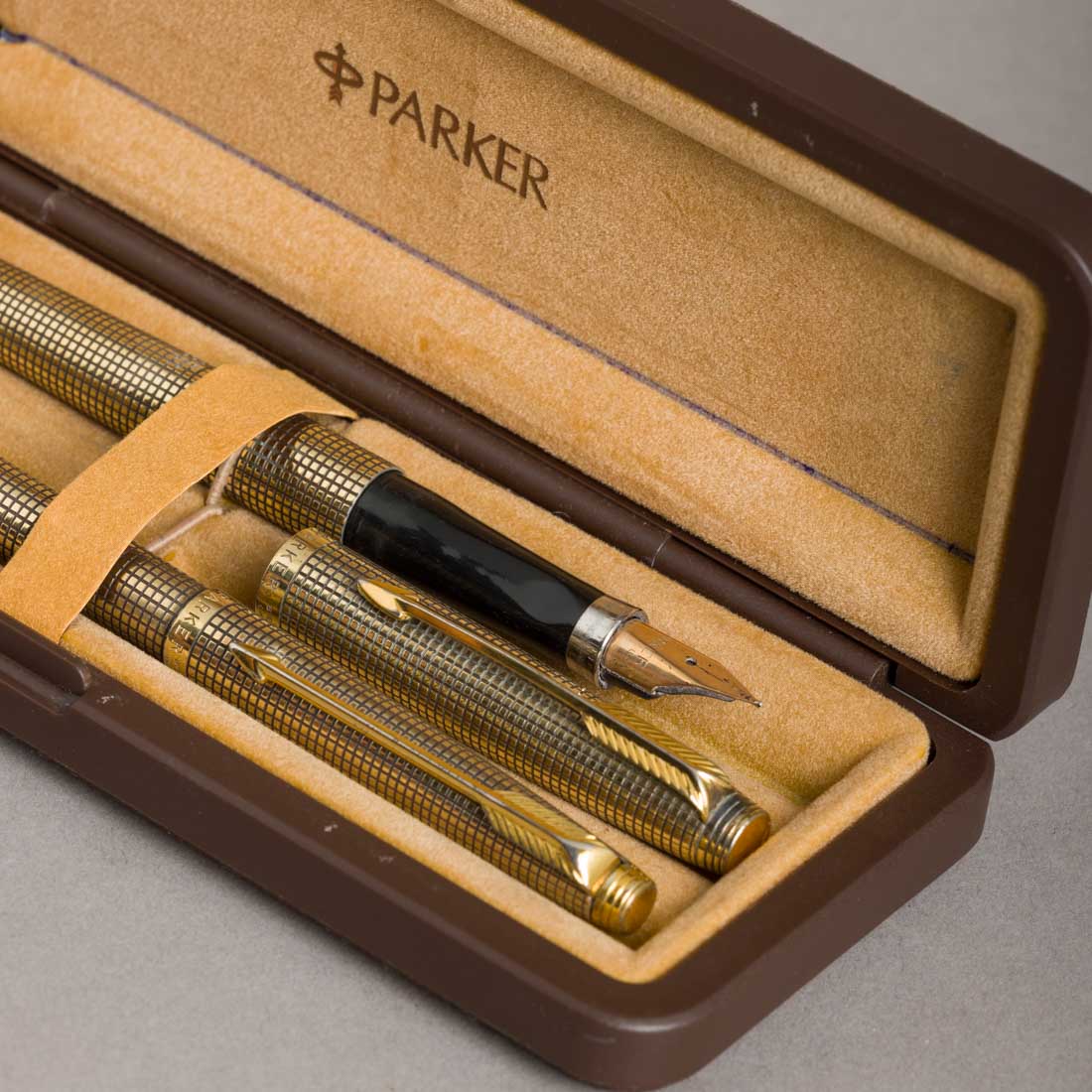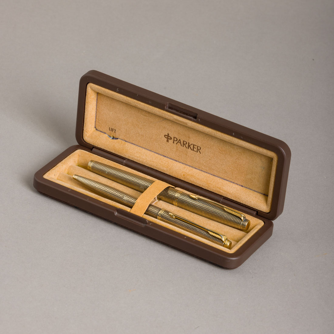 Em prata e plaqué de ouro de 14Kt., aparo em ouro de 14Kt. Fabricadas nos E.U.A. Com estojo original. Sinais de uso, esferográfica com pequena amolgadela.