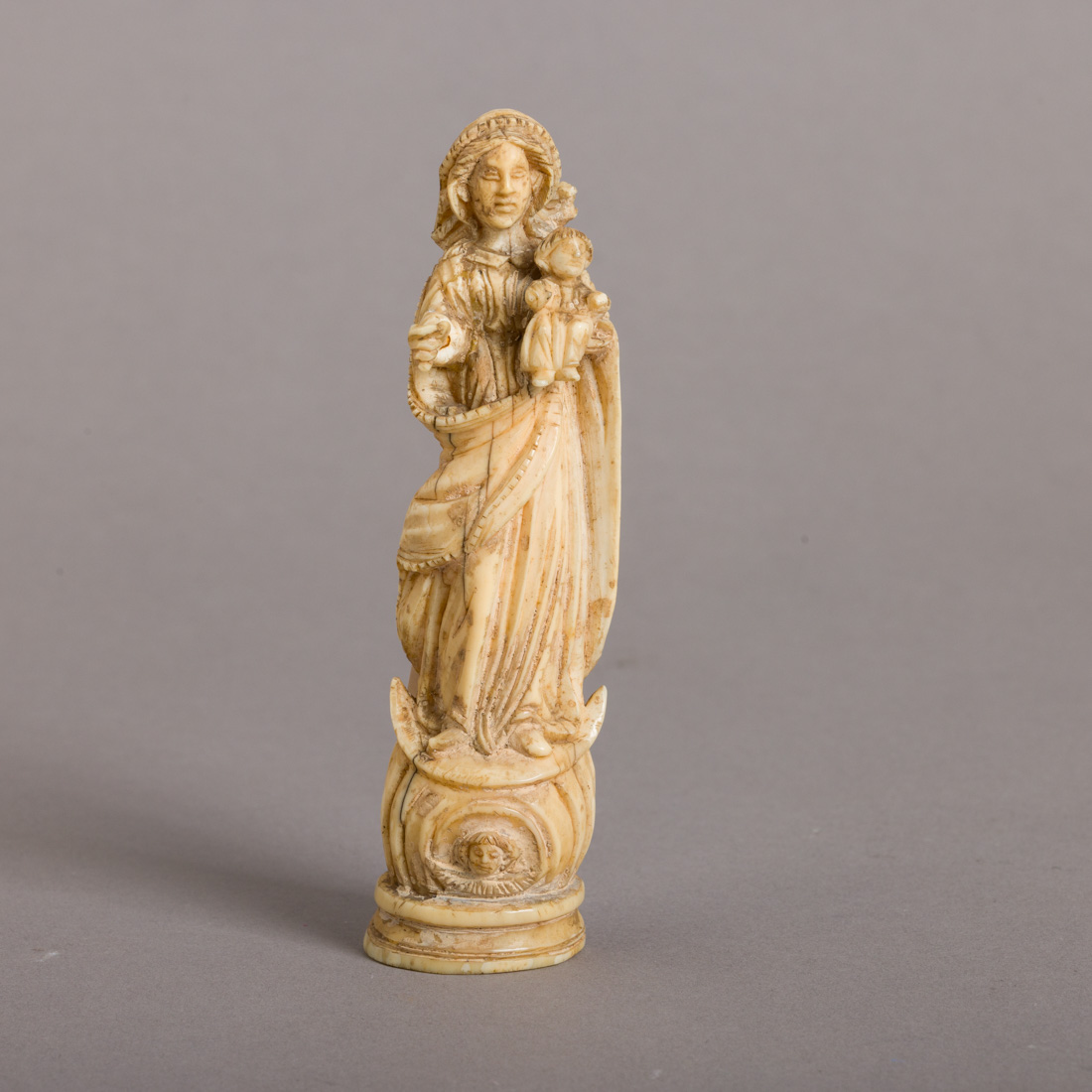 Escultura em marfim. Séc. XIX. Pequenas falhas, fissuras e mão colada.