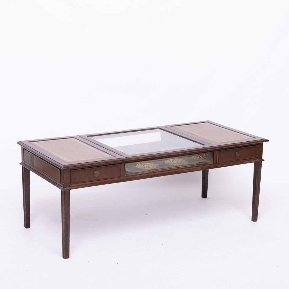 Em mogno, parte central do tampo em vidro com abertura para vitrine, partes laterais em couro com ferros a ouro e duas gavetas. Sinais de uso, pequenos defeitos.