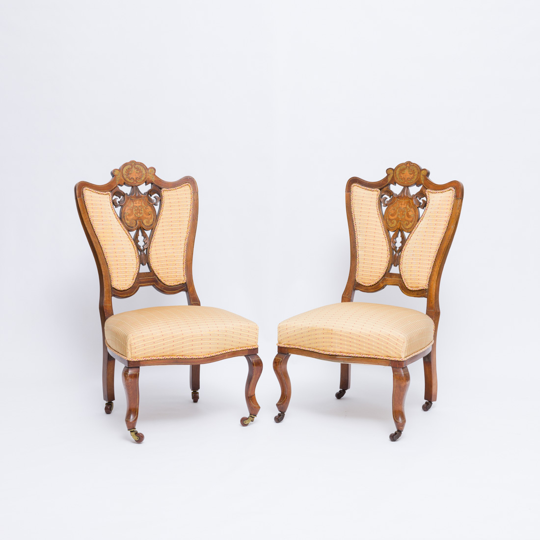 Em diferentes madeiras com marchetaria, tabela vazada, assento e costas estofadas, pés curvos com rodízios. Séc. XIX/XX. Pequenos defeitos.