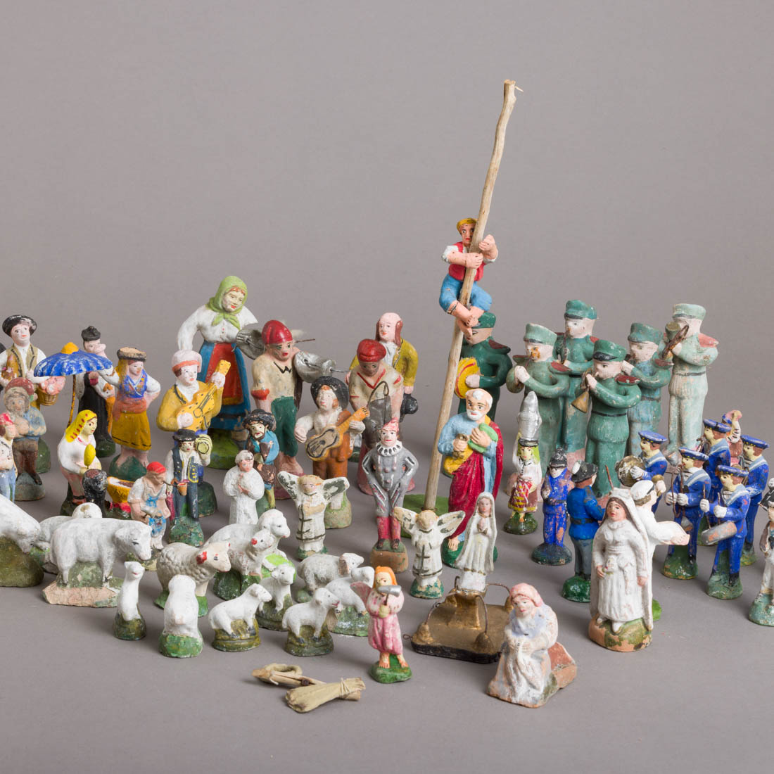 Oitenta e oito esculturas em barro, decoração policromada. Sinais de uso, aproximadamente 16 com falhas e defeitos.