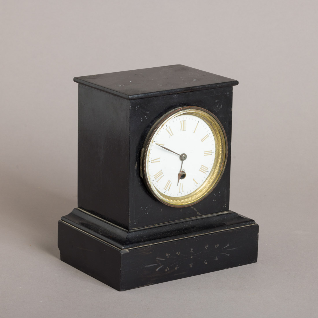 Em mármore negra, mostrador em esmalte com numeração romana. Em marcha, a precisar de revisão. Pequenas esbeiçadelas na mármore e falha no mostrador.
