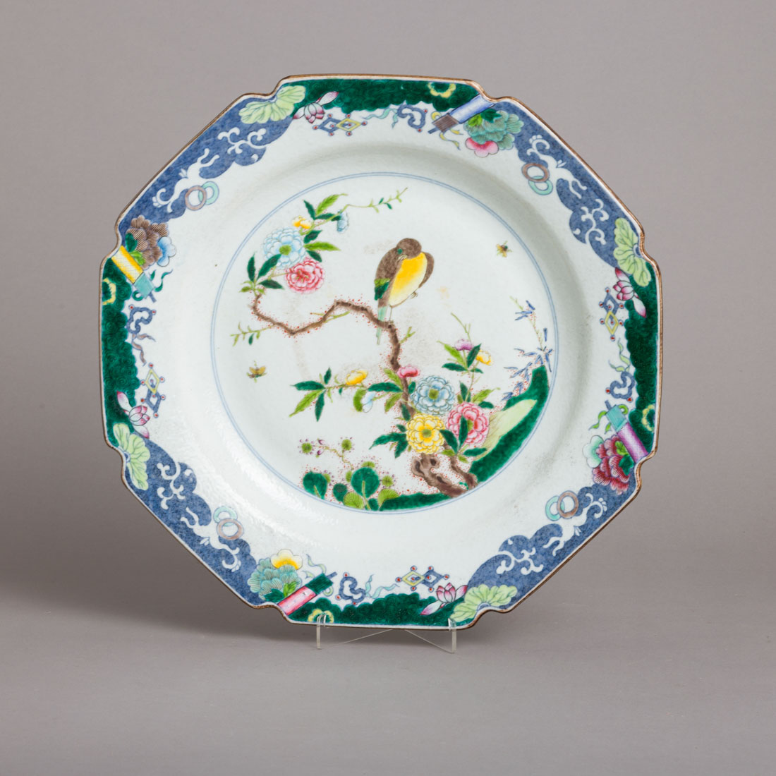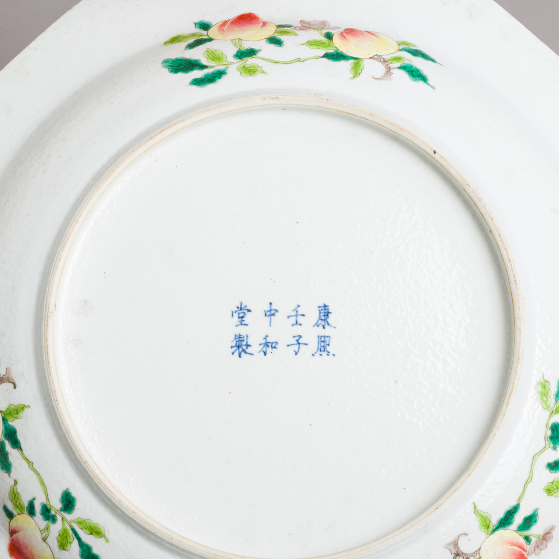 Em porcelana da China, decoração policromada com esmaltes da família verde "pássaro, insectos e flores", no verso da aba "pêssegos". Marcada. Pequeno cabelo.