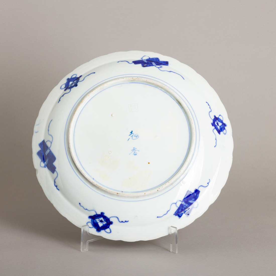 Em porcelana do Japão marcado, decoração policromada e dourada "cena do quotidiano", na aba flores, frutos e borboletas. Sinais de uso.