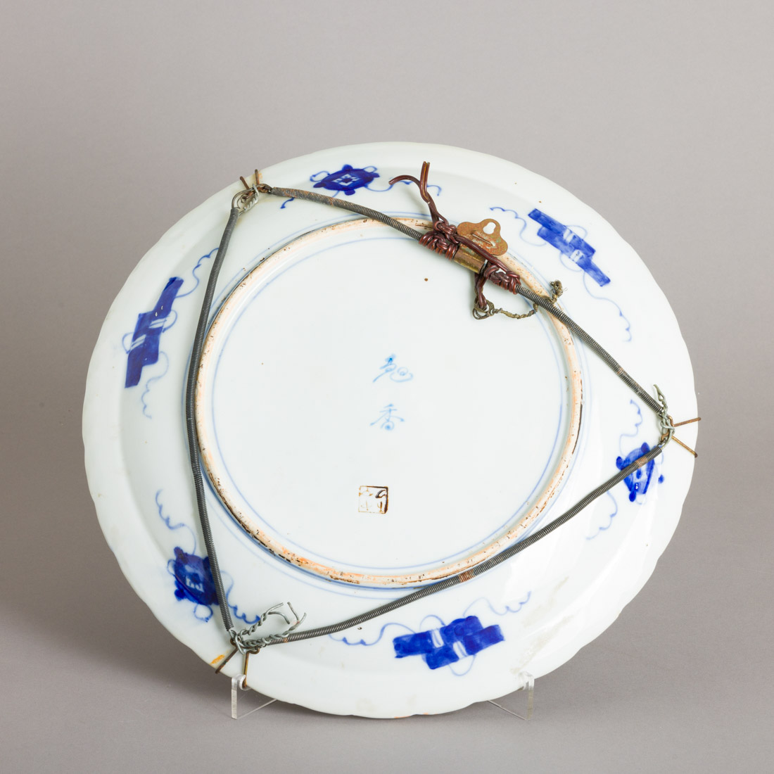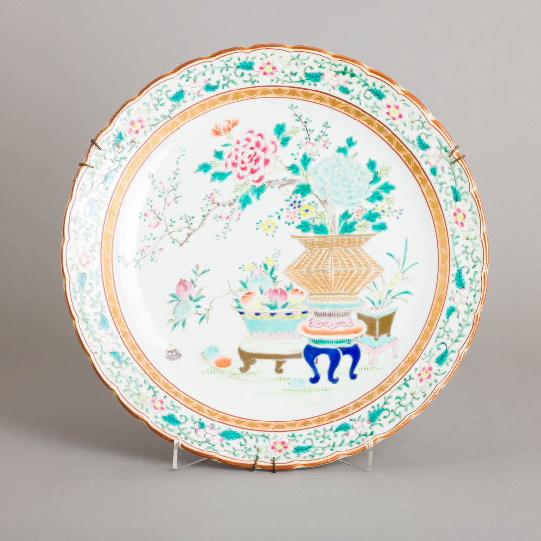 Em porcelana da China, decoração policromada e dourada "objectos, flores e frutos". Marcado. Sinais de uso.