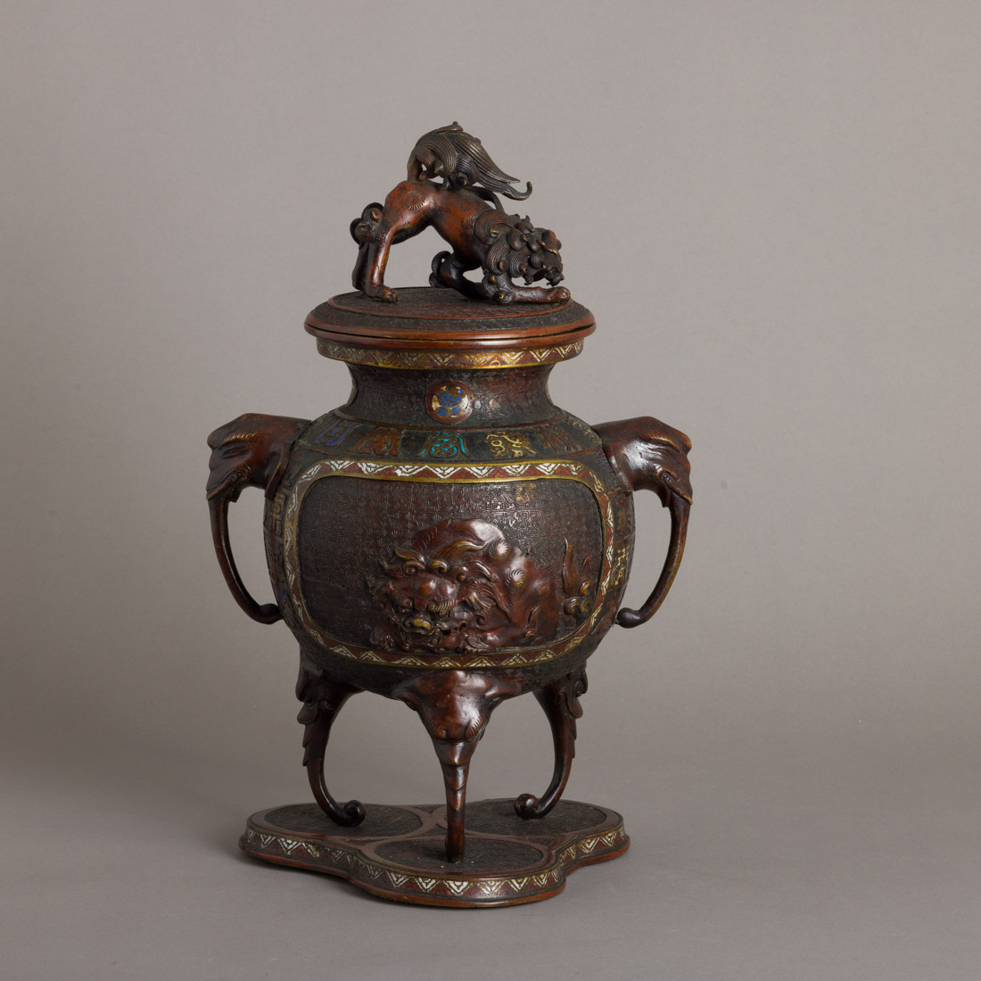 Em metal patinado, decoração gravada e esmaltes cloisonné, decoração policromada caracteres e "cães de foo" em relevo, pegas e pés "cabeças de elefantes". Sinais de uso, tampa com pequenos defeitos e soldaduras.
