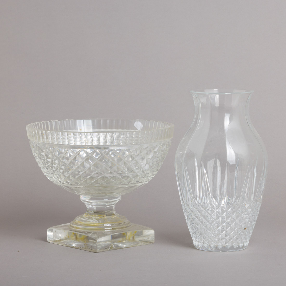 Em vidro moldado e lapidado. Sinais de uso, taça com canto da base colada e falhas.