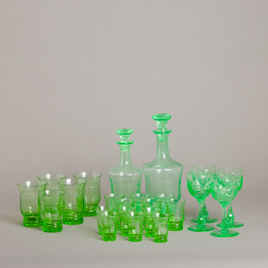 Em vidro verde, decoração relevada e gravada. Sinais de uso, cinco copos com esbeiçadelas e tampa de garrafa colada.