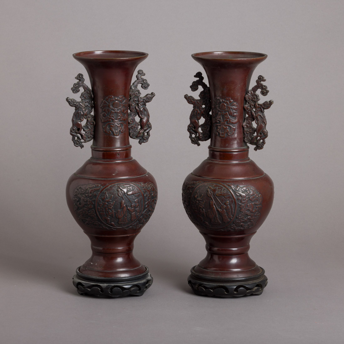 Em metal patinado, decoração relevada, reservas "cenas de cortejo", asas vazadas com "animais mitológicos". Base em madeira entalhada e vazada. Japonesas. Pequenos defeitos e uma com leve amolgadela na base.