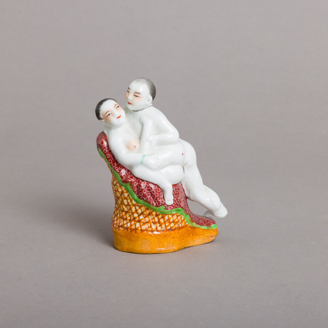 Escultura em porcelana oriental, decoração policromada. Marcada. Sinais de uso.