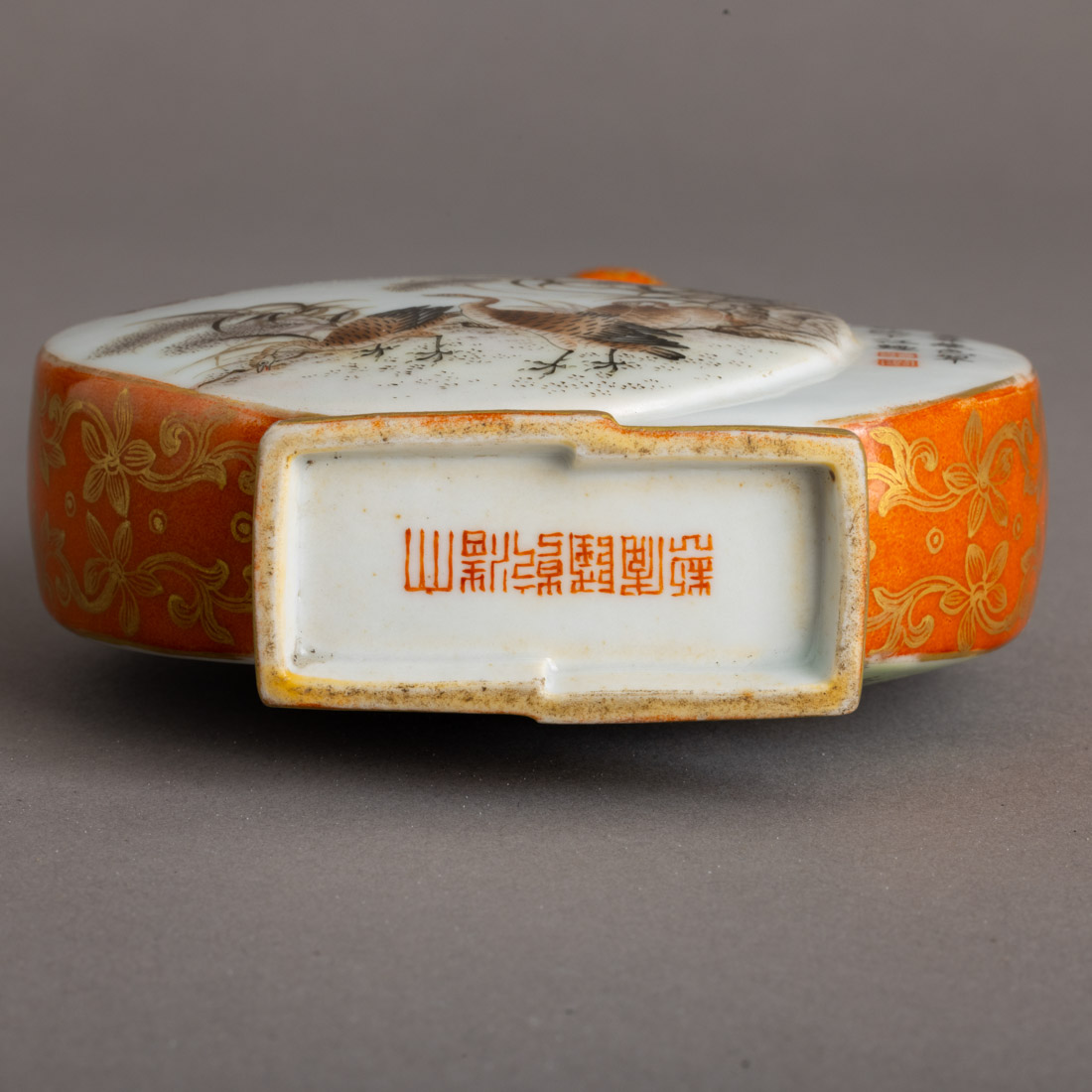 Em porcelana da China, decoração rouge de fer e a dourado, reservas policromas "paisagens com pássaros" e caracteres. Marcada. Sinais de uso e leve desgaste.