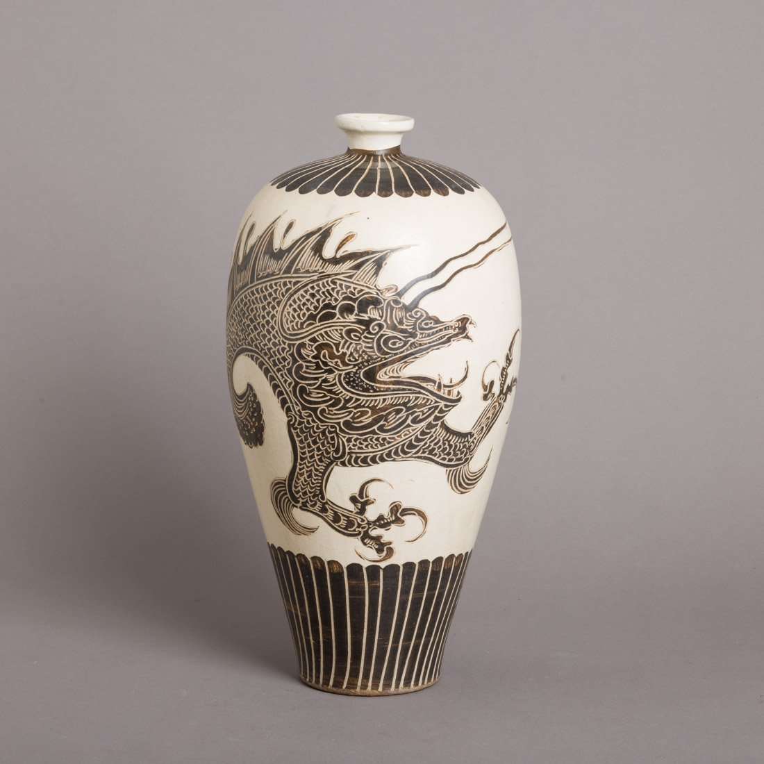 Em cerâmica chinesa, decoração a negro "animal fantástico". Sinais de uso.