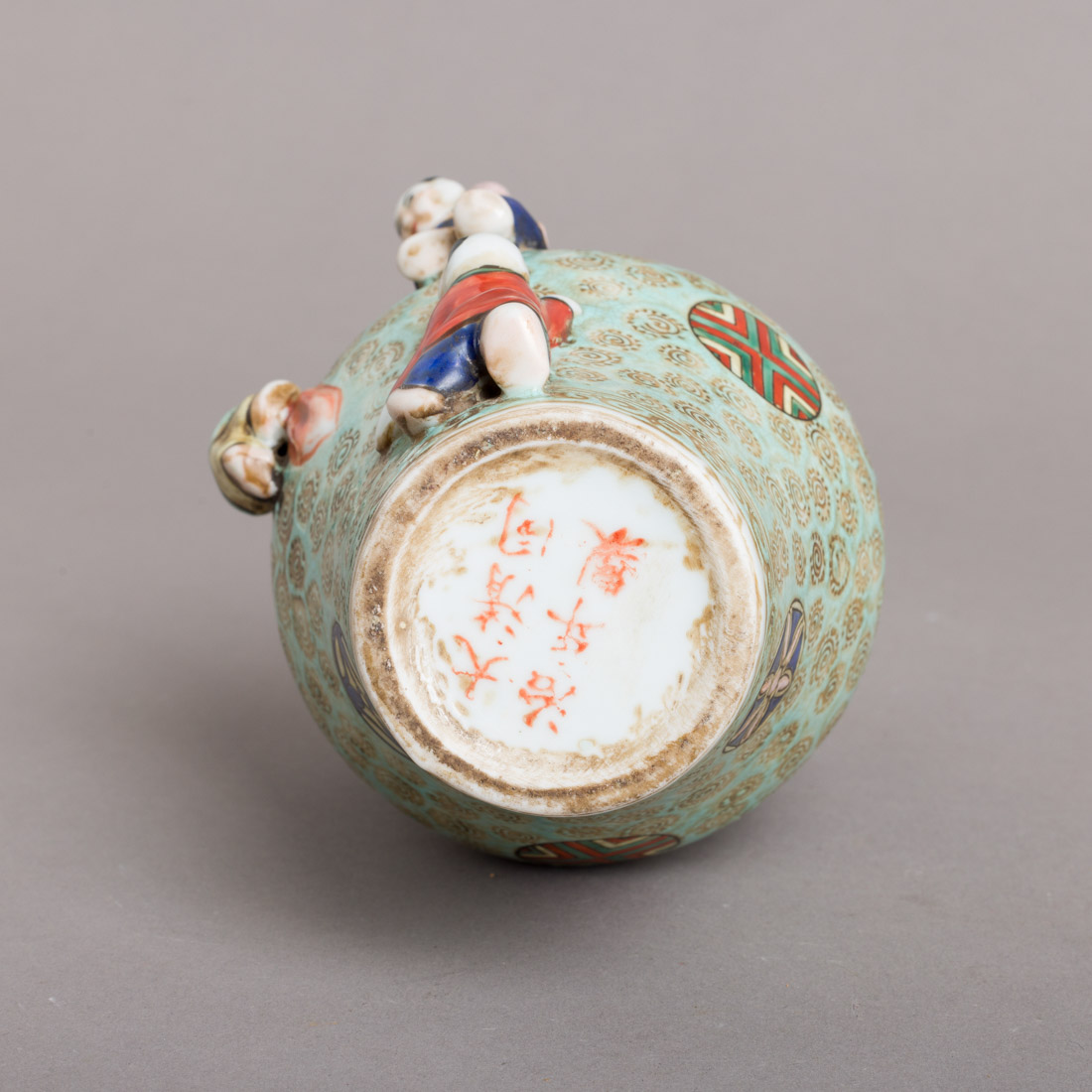 Em porcelana da China, decoração policromada e dourada com "Laughing boys" em relevo, sobre fundo verde celadon. Marcada. Sinais de uso.