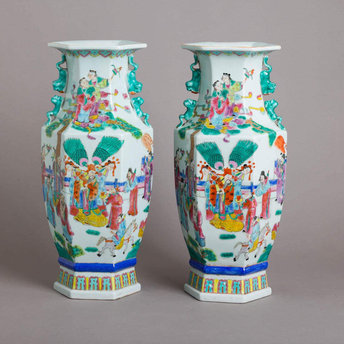 Em porcelana da China, decoração policromada "figuras em cenas do quotidiano" e pegas relevadas. Sinais de uso, uma com cabelo na boca