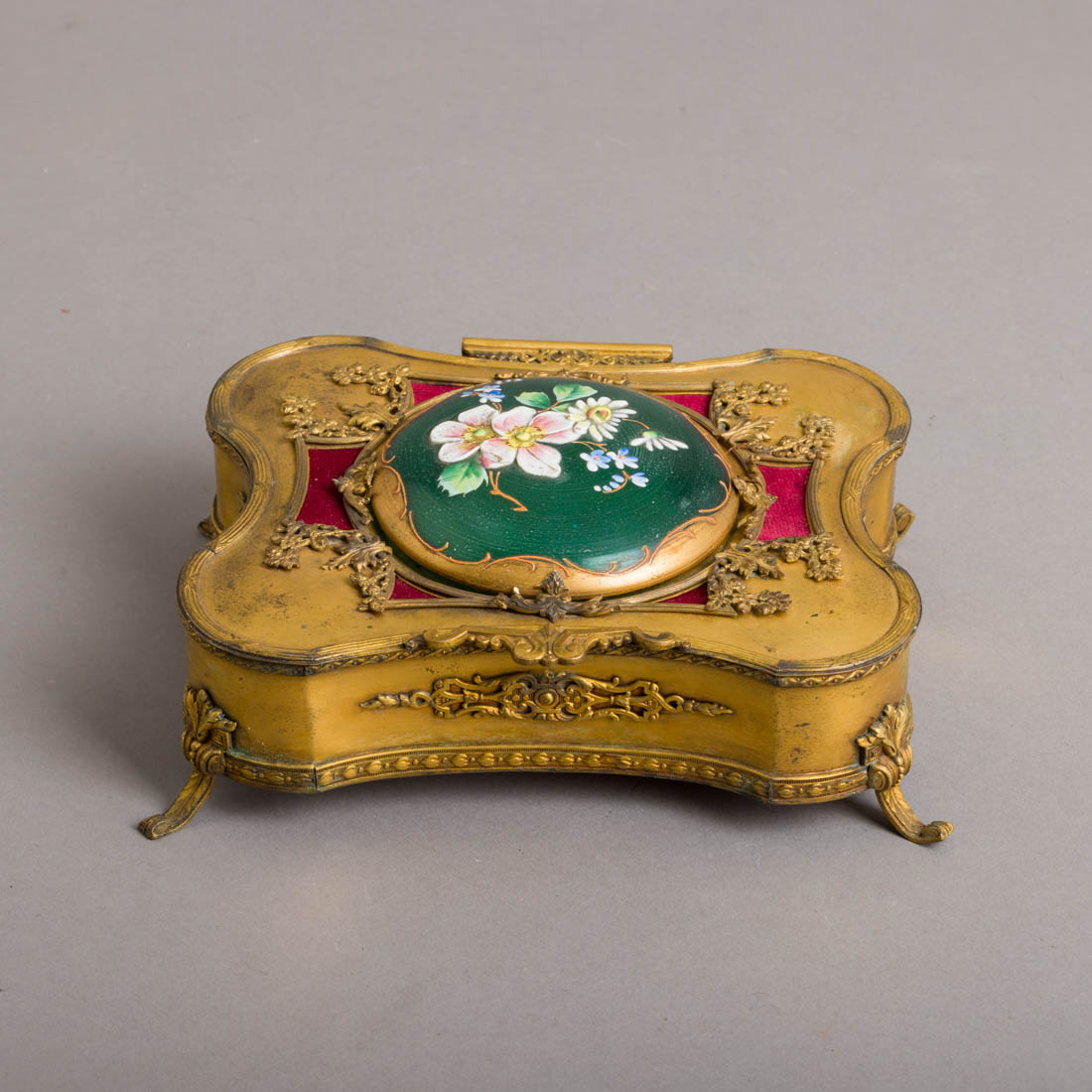 Em metal dourado, decoração relevada "elementos vegetalistas, na tampa aplicação em vidro verde pintado "flores". Leves amolgadelas e desgaste, pequenas falhas e um pé amolgado.