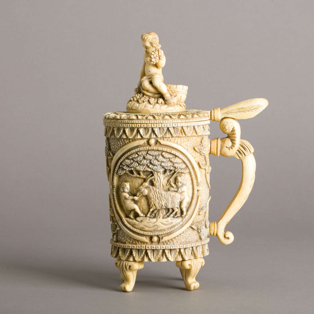 Em marfim esculpido, decorado com elementos vegetalistas, reservas representando meninos com cabra e tampa encimada por menino com uvas. Sinais de uso.