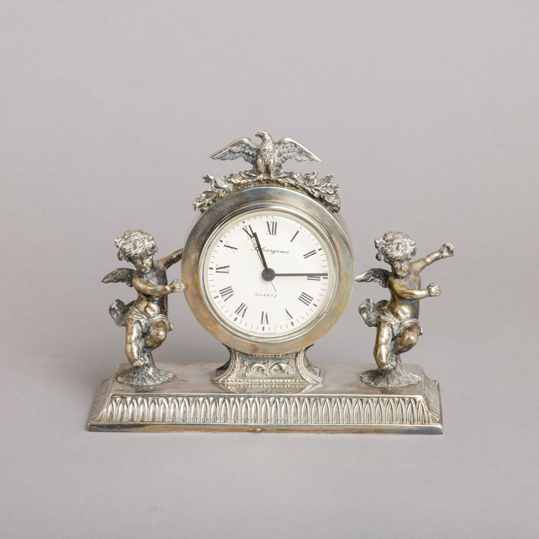 Em prata espanhola de 915 marcas de garantia de teor (pós 1934), decoração relevada "Putti", encimado por águia, movimento a quartzo. Sinais de uso.