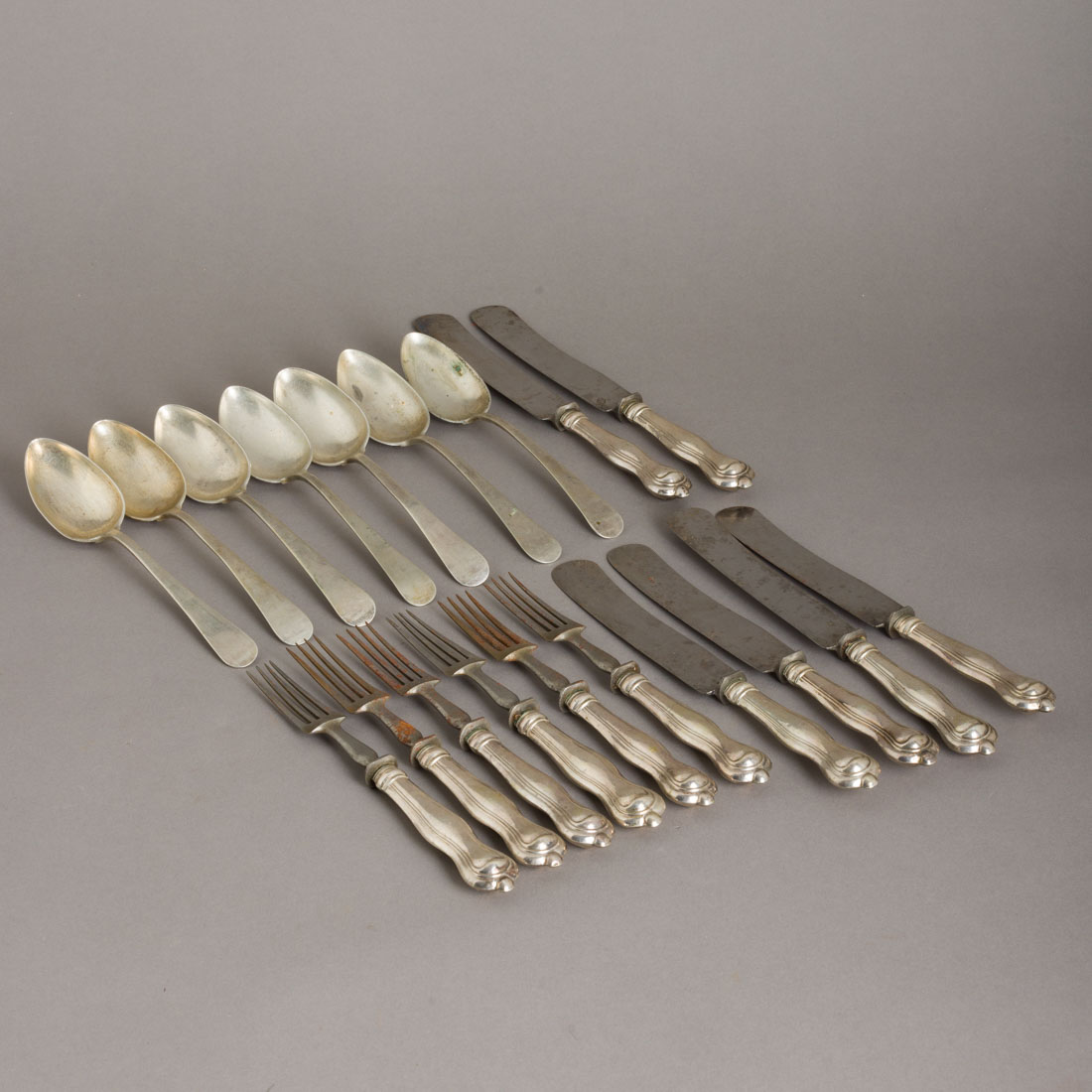 Colheres em prata do Séc. XIX, marca de ensaiador de Lisboa (L-35) José Joaquim da Costa e de ourives (L-287) João Ferreira Cezimbra, decoração lisa, talheres com cabos em prata sem marcas, ao abrigo do D/L. nº. 120/2017. Peso total aprox.: 1140 g. Sinaisde uso e oxidações.