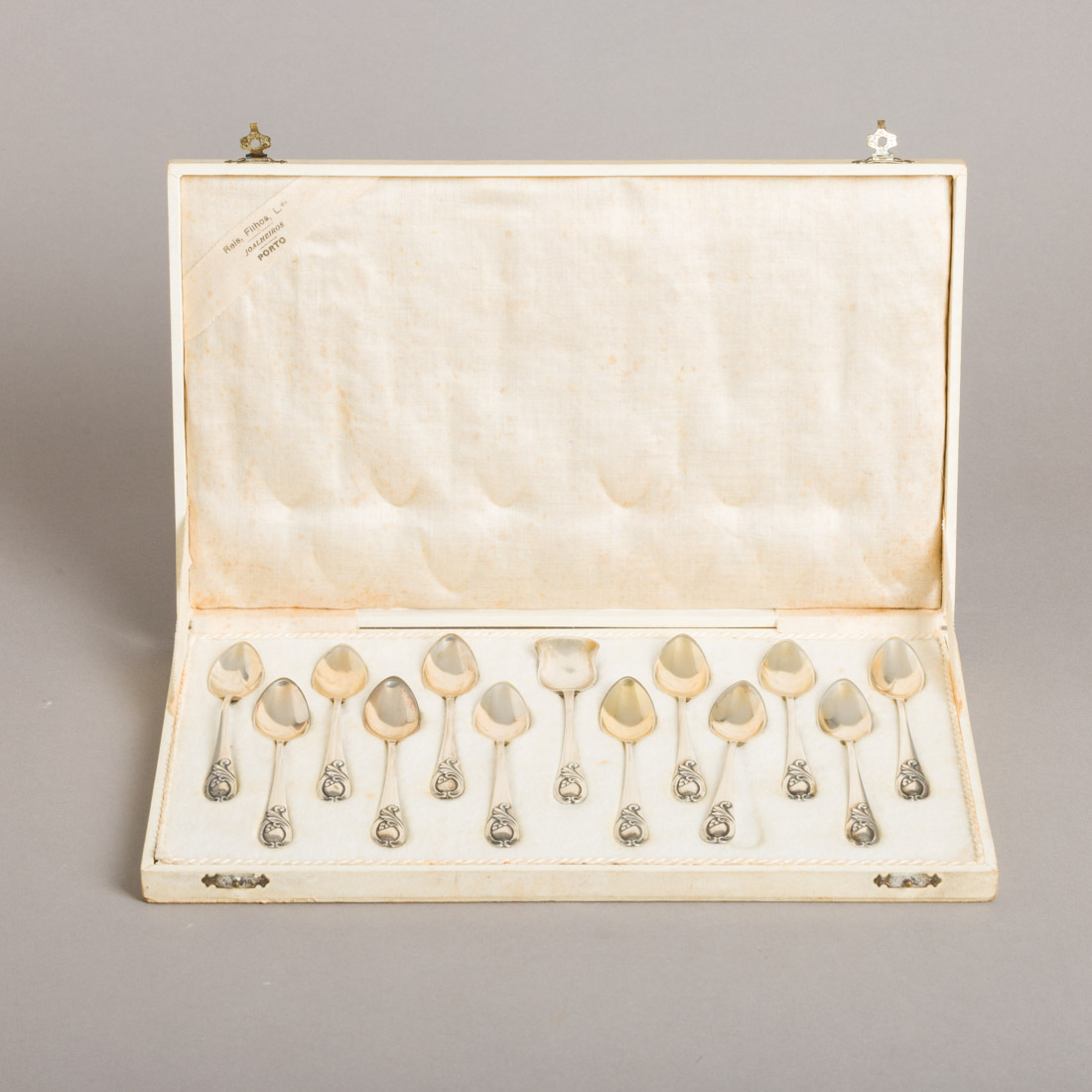 Em prata portuguesa contraste javali (1887-1937) de 833, decoração relevada com enrolamentos. Em estojo. Sinais de uso.