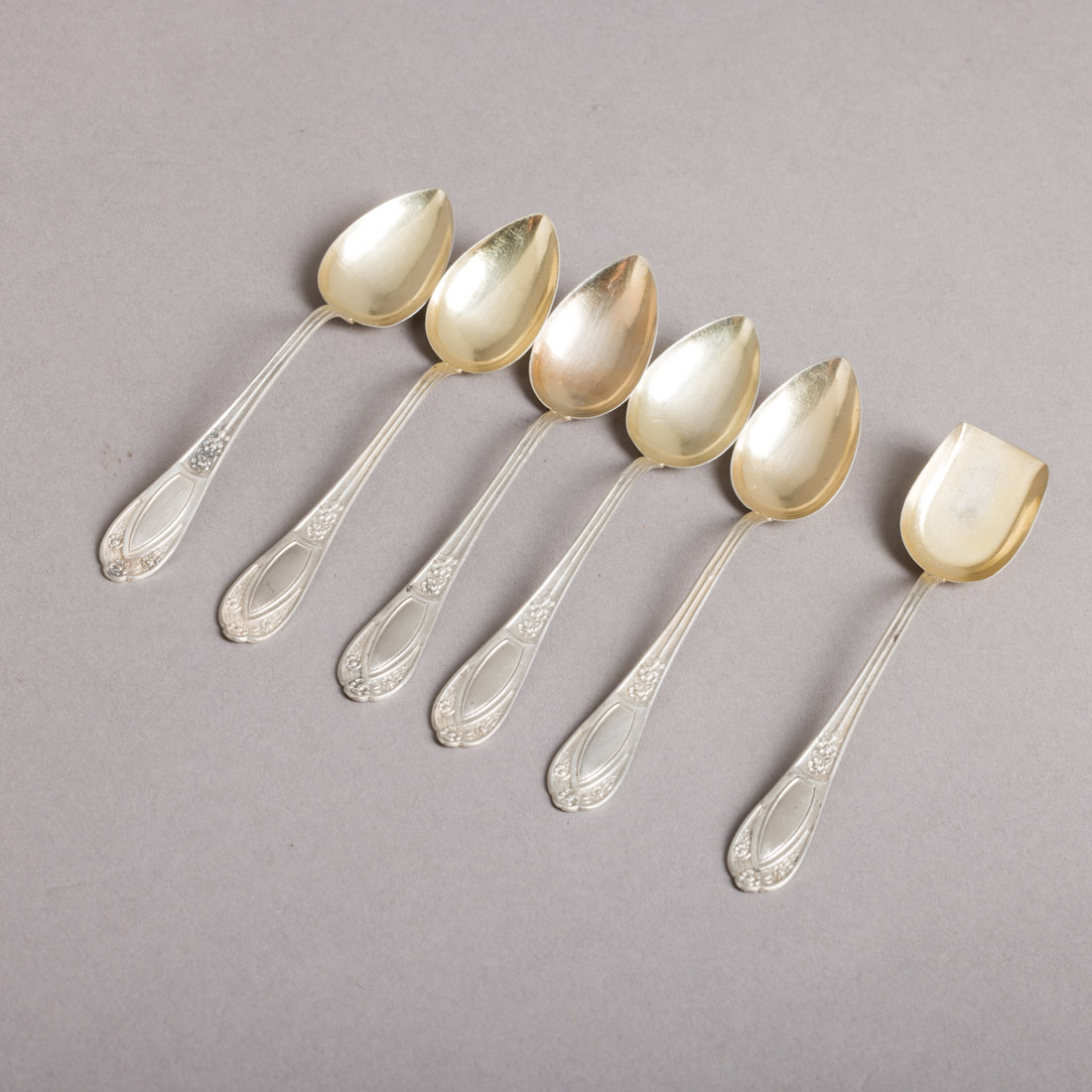 772. CONJUNTO DE CINCO COLHERES DE CAFÉ E CONCHA DE AÇÚCAR