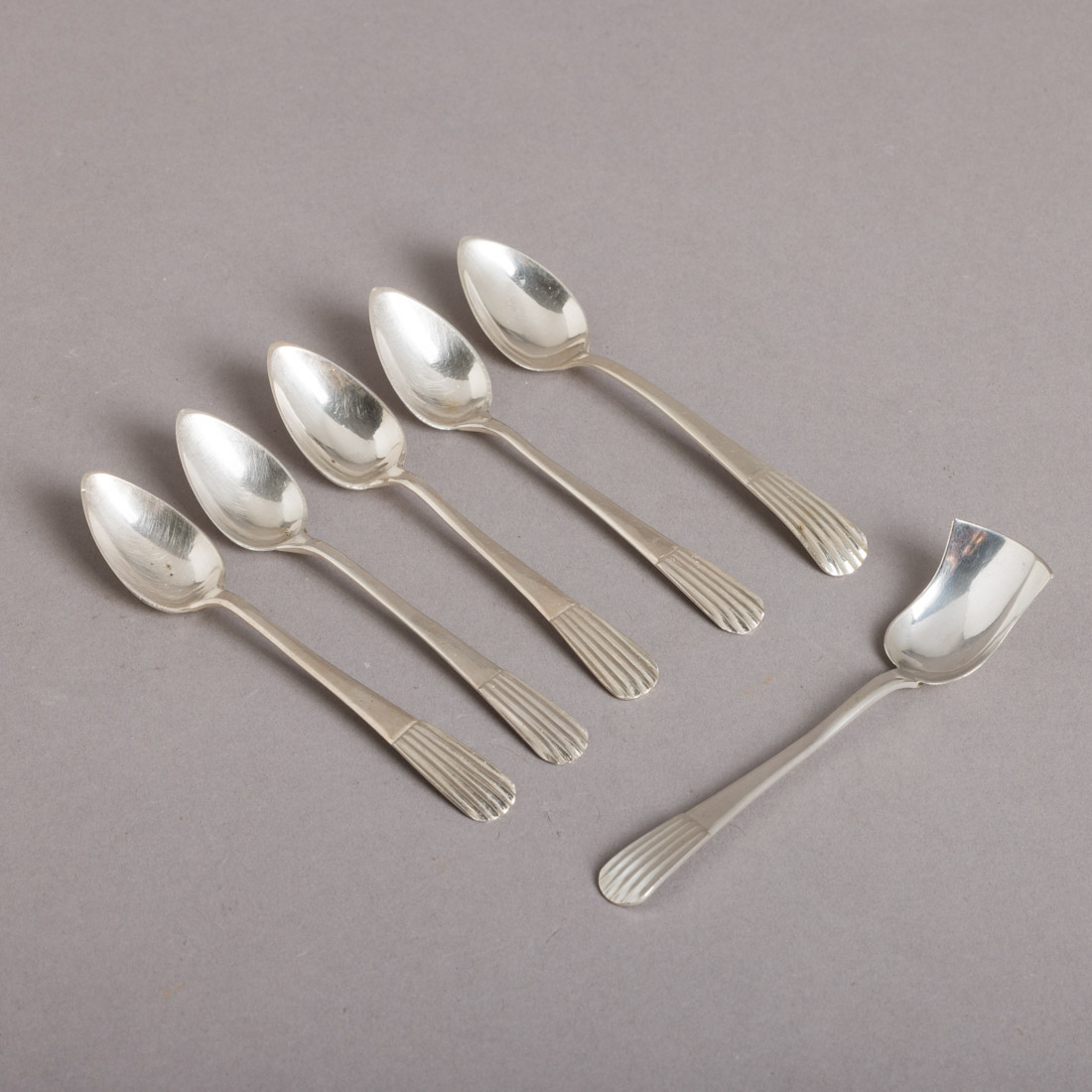 774. CONJUNTO DE CINCO COLHERES DE CHÁ E CONCHA DE AÇÚCAR
