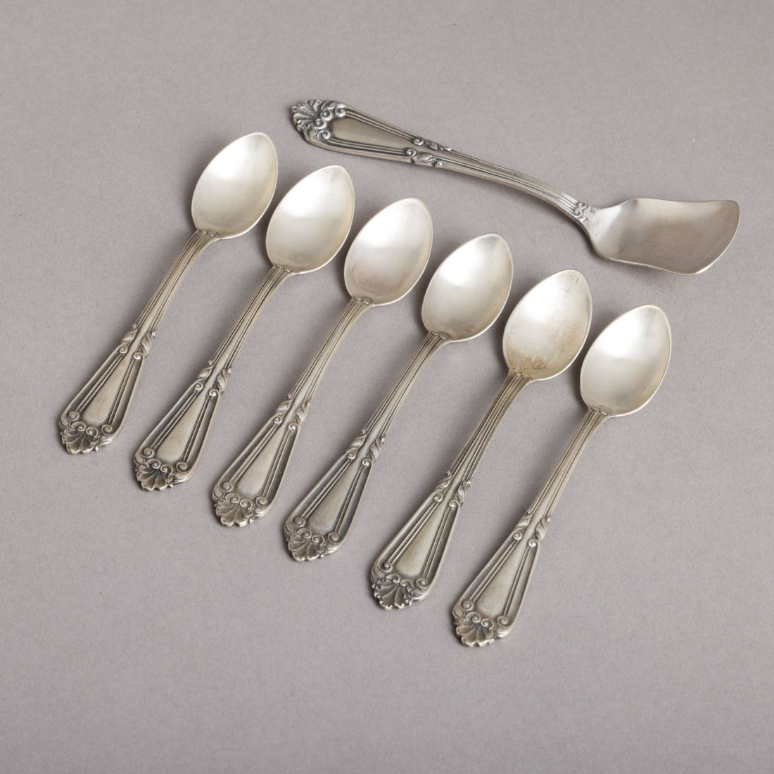 780. CONJUNTO DE SEIS COLHERES DE CAFÉ E CONCHA DE AÇÚCAR