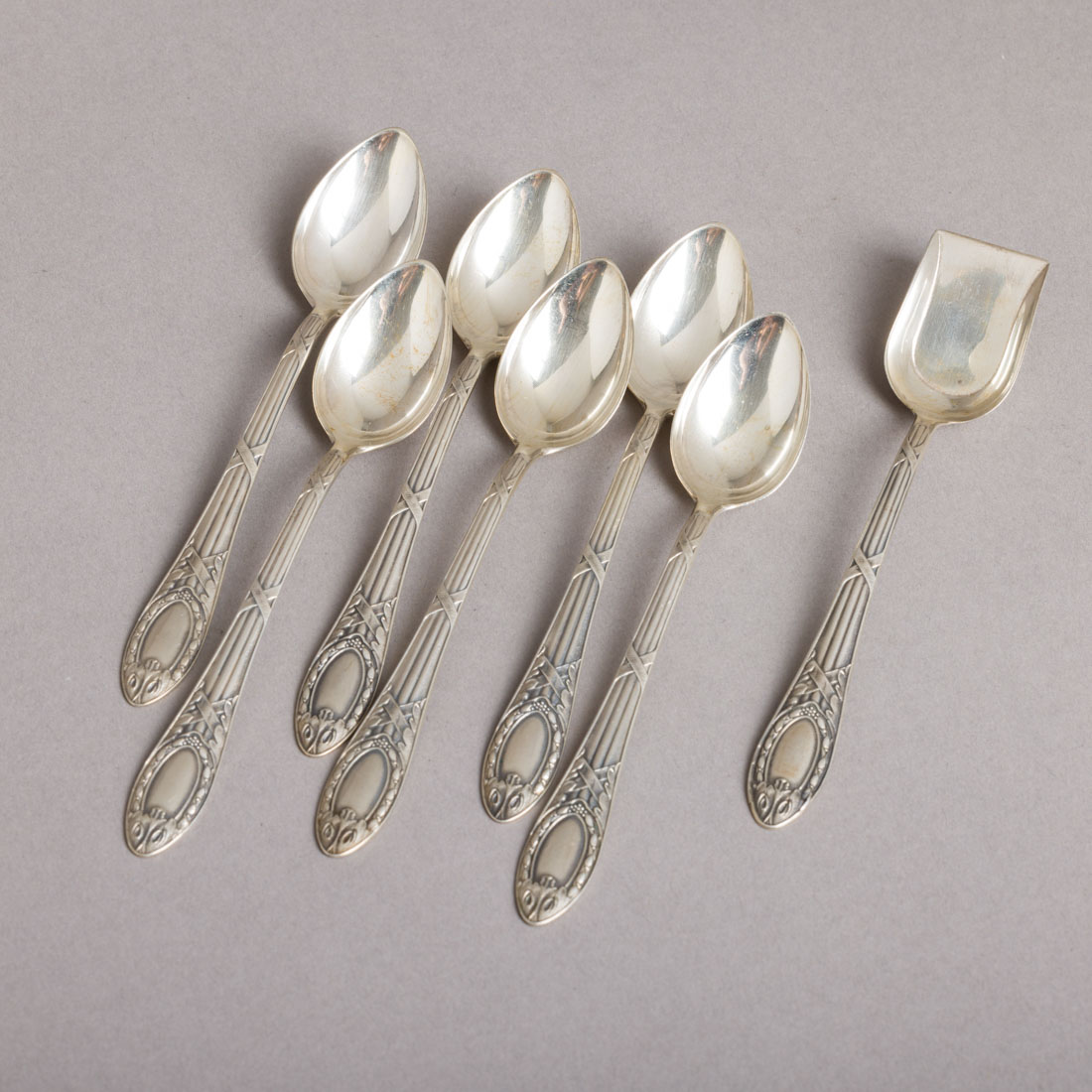 781. CONJUNTO DE SEIS COLHERES DE CAFÉ E CONCHA DE AÇÚCAR