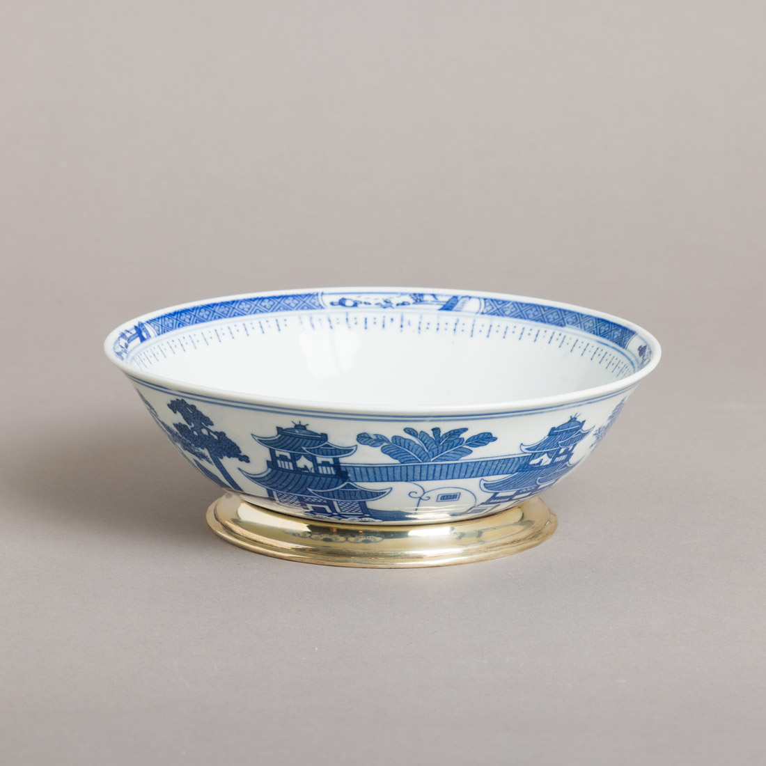 Em porcelana da China, decoração a azul "paisagem com pagodes e figuras" base em prata portuguesa contraste águia (pós 1985) de 835. Sinais de uso.