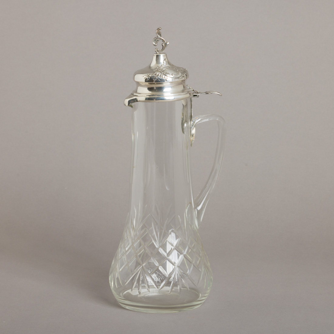 Em cristal moldado, tampa em prata portuguesa contraste javali (1887-1937) de 833, decoração relevada com elementos vegetalistas. Sinais de uso e pequeno cabelo junto à asa.