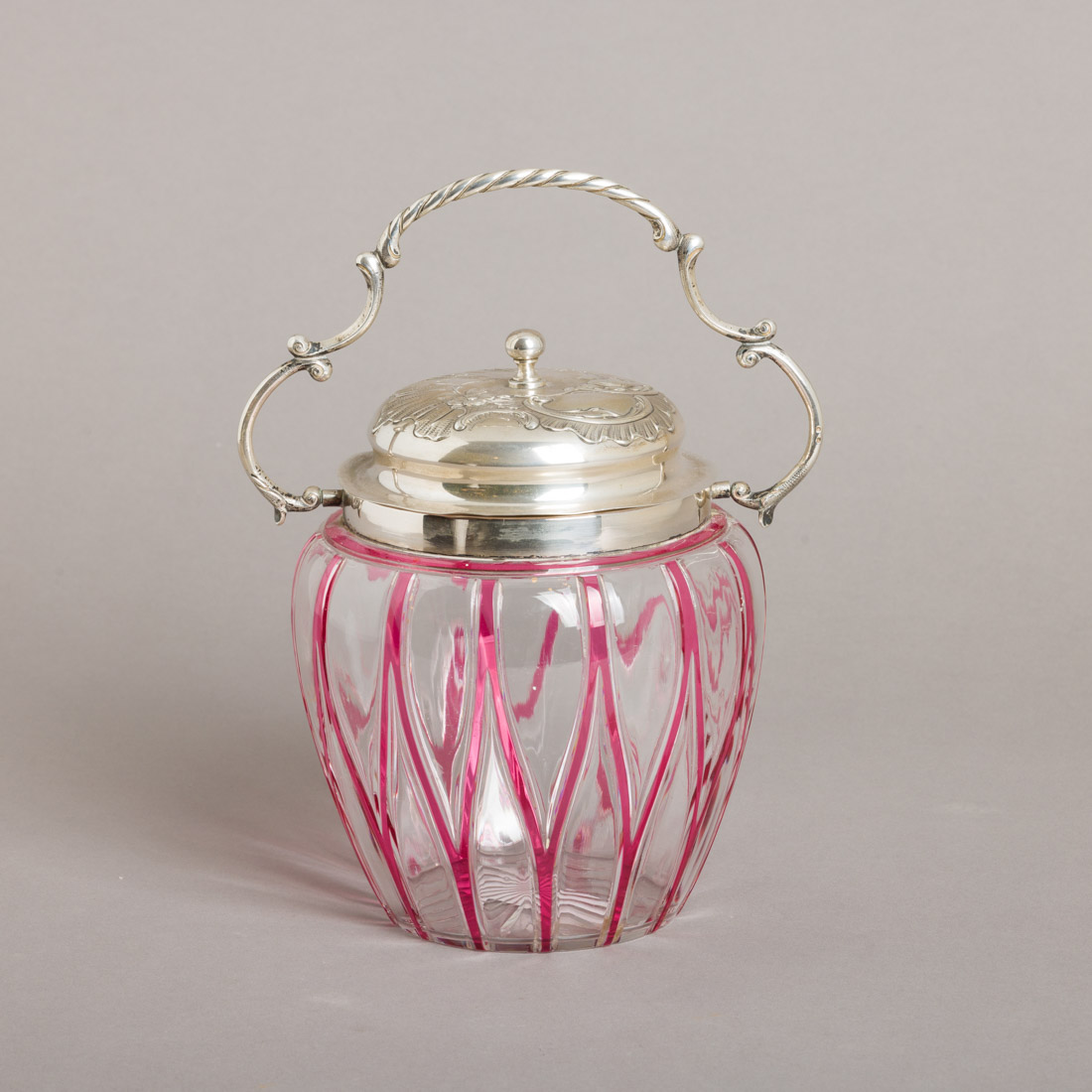 Em vidro bicolor, aro, tampa e pega em prata portuguesa contraste javali (1887-1937) de 833, decoração relevada "flores". Sinais de uso, tampa com amolgadelas no bordo.