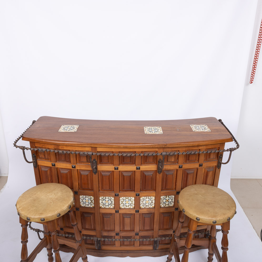 Em diferentes madeiras com almofadas, aplicações de azulejos policromados e elementos em ferro forjado. Bancos de pernas torneadas estofados a pele com pregaria. Sinais de uso e pequenos defeitos.