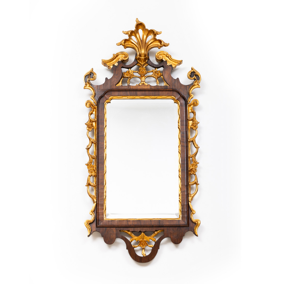 Estilo D. José, moldura em madeira folheada a pau santo com entalhamentos dourados. Sinais de uso e pequenos defeitos.