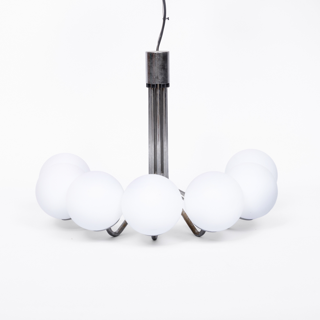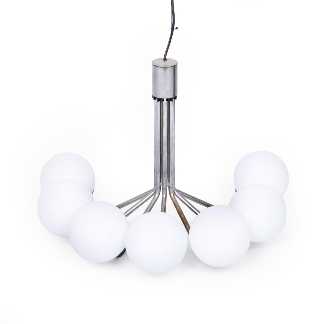 Em metal cromado, globos em vidro opalino. Sinais de uso e pontos de oxidação.