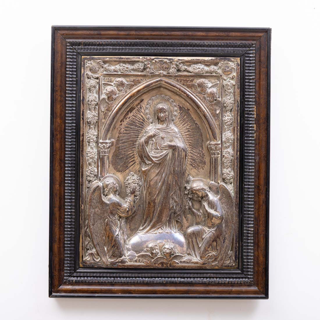 Revestida a metal prateado decoração relevada, moldura em madeira escurecida com friso de tremidos. Desgaste e pequeno defeitos.