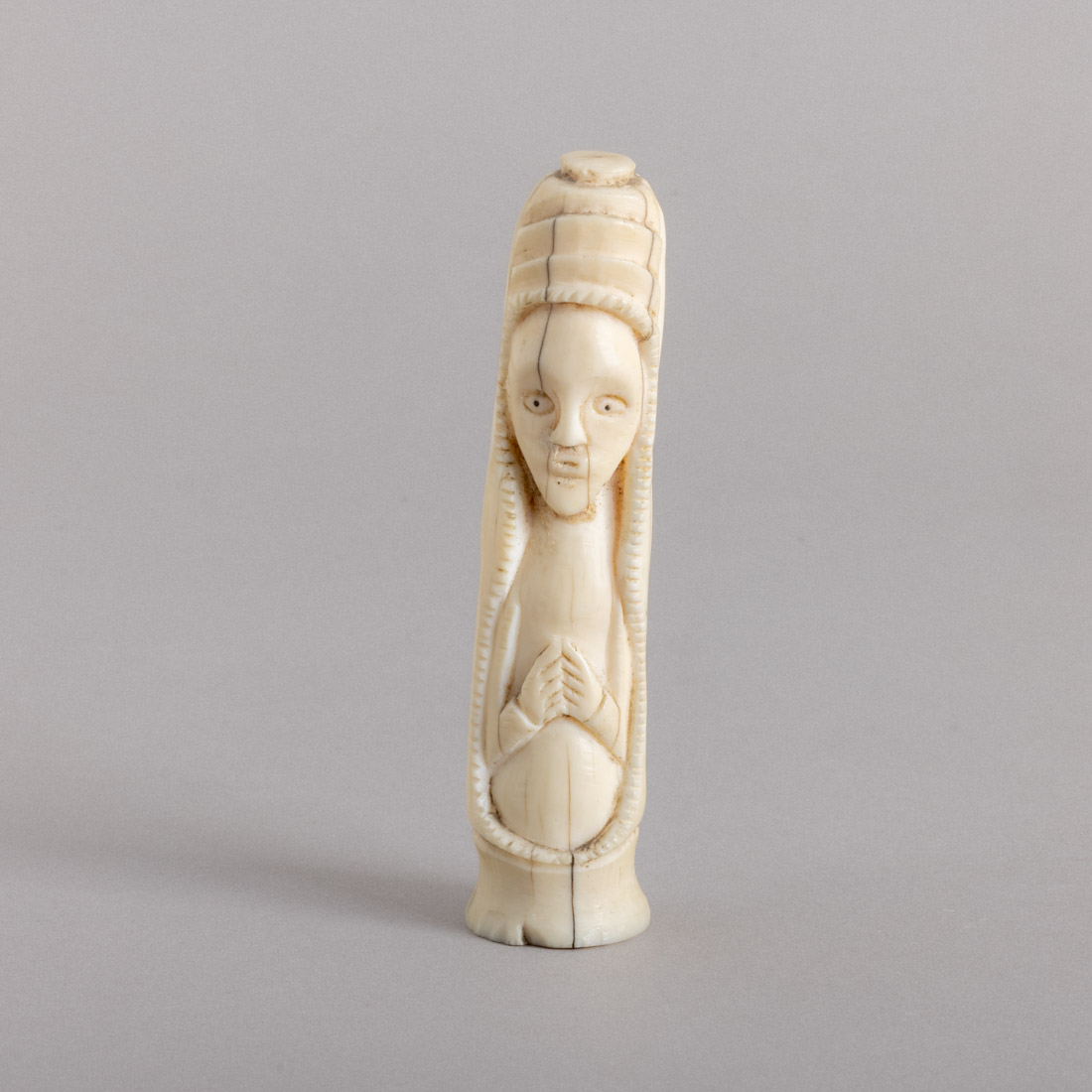 Esculpido em osso, decoração relevada "figura". Pequenas falhas e fissuras.