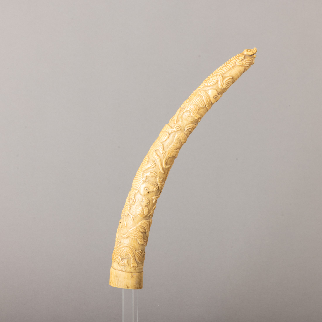 Esculpido em ponta de hipopótamo decoração relevada com animais. África. Sinais de uso.
