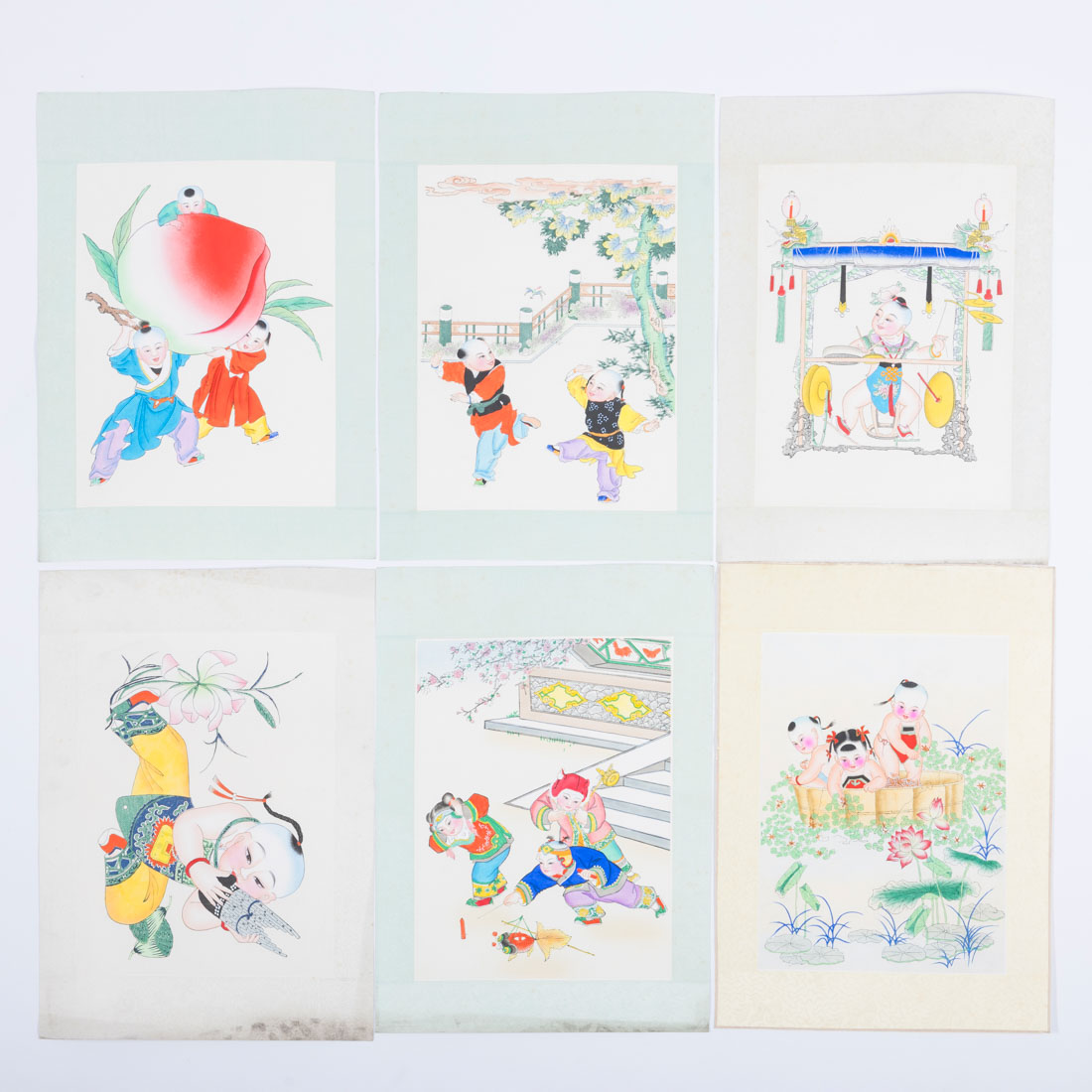 Seis aguarelas sobre papel. Sinais de uso e leves manchas.