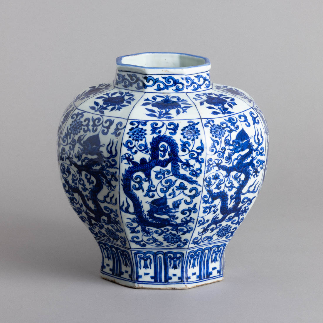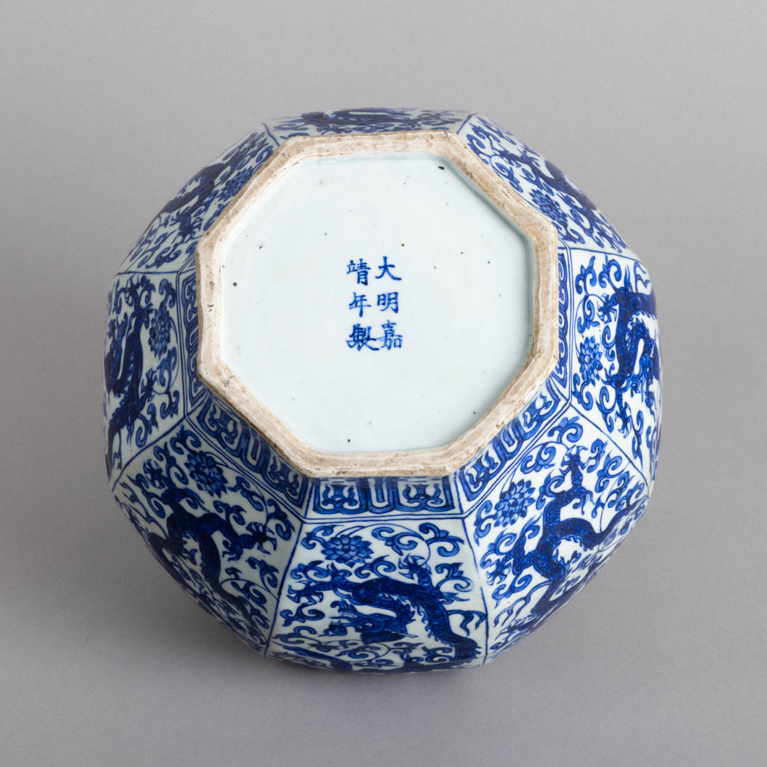 Em porcelana da China, decoração a azul "dragões e flores". Marcada. Sinais de uso.