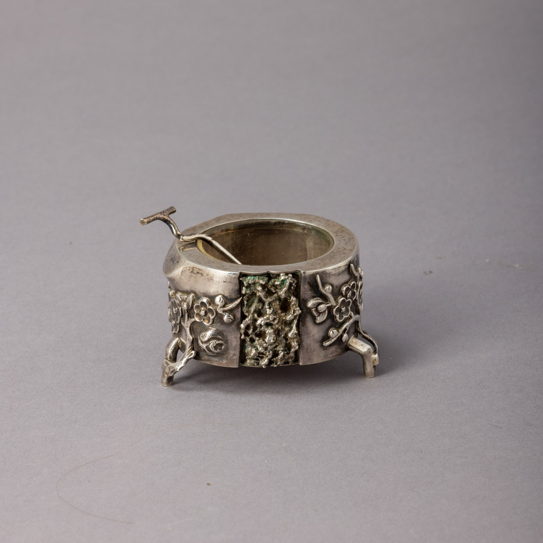 Em prata chinesa de 900, Séc. XIX/XX, marca de garantia de teor e de ourives Wahhinglon, decoração relevada "flores", alma em vidro. Sem marcas portuguesas, ao abrigo do Decreto-Lei n.º 120/2017. Sinais de uso.