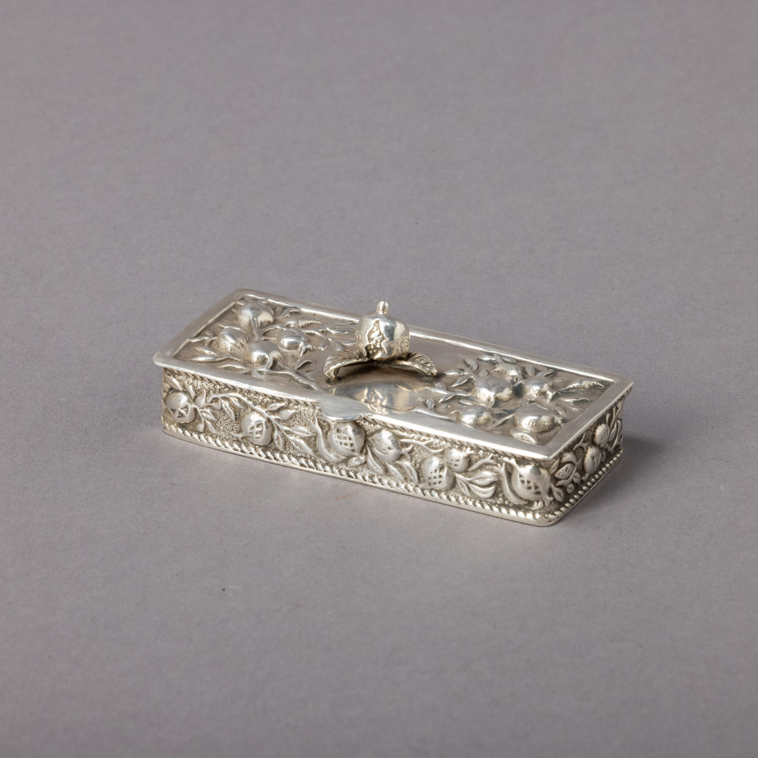 Em prata de 925, decoração relevada "frutos". Sem marcas, ao abrigo do Decreto-Lei n.º 120/2017. Sinais de uso, leves amolgadelas.