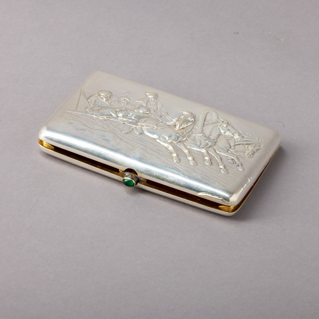 Em prata russa de 875, marcas de garantia de teor e de ourives Ivan Andreyevich Ado (1899-1916), decoração relevada "Troika", fecho com pedra verde em cabochon, interior dourado. Sinais de uso.