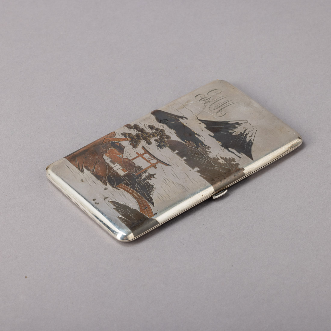 Em prata japonesa marcada, de várias colorações, decoração "paisagem oriental", monogramada. Pequenas amolgadelas. Sem marcas portuguesas, ao abrigo do Decreto-Lei n.º 120/2017. Sinais de uso, pequenas amolgadelas.