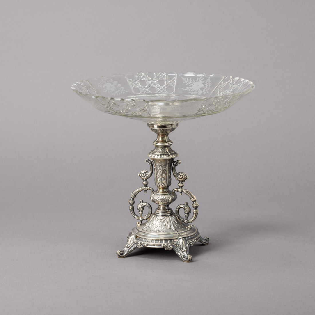 Em prata portuguesa contraste javali (1887-1937) de 833, decoração relevada com elementos vegetalistas, taça recortada em cristal lapidado e gravado "flores". Ínfima esbeiçadela.