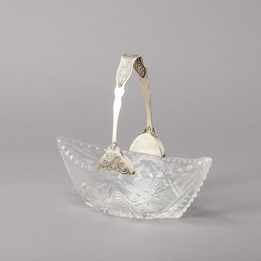 Em vidro moldado, asa em prata decoração relevada com enrolamentos. Sem marcas, ao abrigo do Decreto-Lei n.º 120/2017. Sinais de uso.