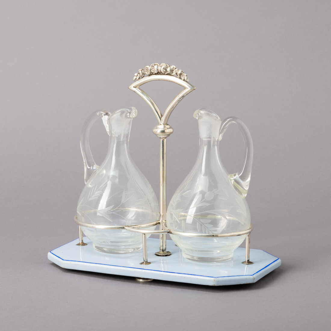 Base em porcelana da Vista Alegre (1947-1968), decoração monocroma a azul, armação em prata portuguesa contraste águia (1938-1984) de 833, galhetas em vidro com gravados, sem tampas.
